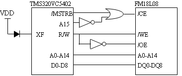 8bit 并行引导装载的实现电路如图1所示。其中A15经过非门与/MSTRB相或是为了防止C5402的内部16K DARAM(0000H-3FFFH)与外部FRAM冲突,同时,对应上并行引导装载模式的引导表设置相对应。